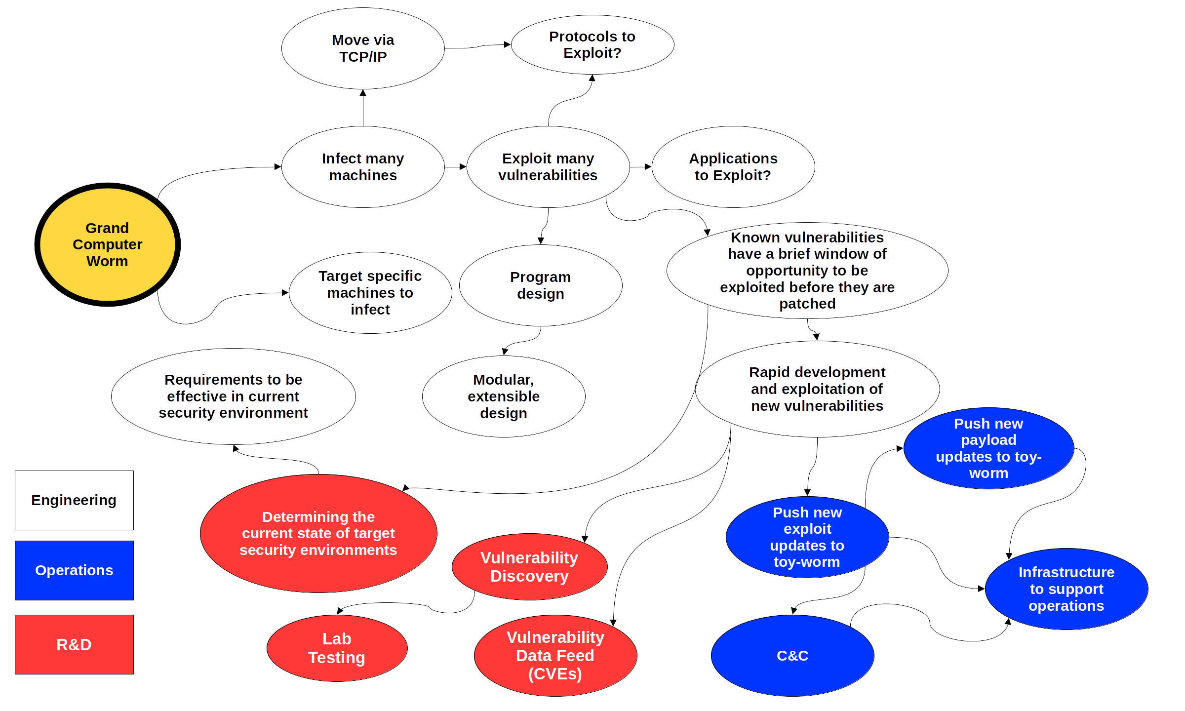 In short the focus of the worm is to infect as many machines as possible. This requires building in a wide variety of exploits. Each exploit has a brief window of opportunity to exploit any known vulnerabilities before they are patched. To support the rapid exploitation of these vulnerabilities requires the rapid development of exploits, which requires the operational ability to push software updates and the infrastructure to support it. Rapid exploitation of vulnerabilities can also be achieved through R&D efforts in finding new vulnerabilities. The red ovals derive from this insight.